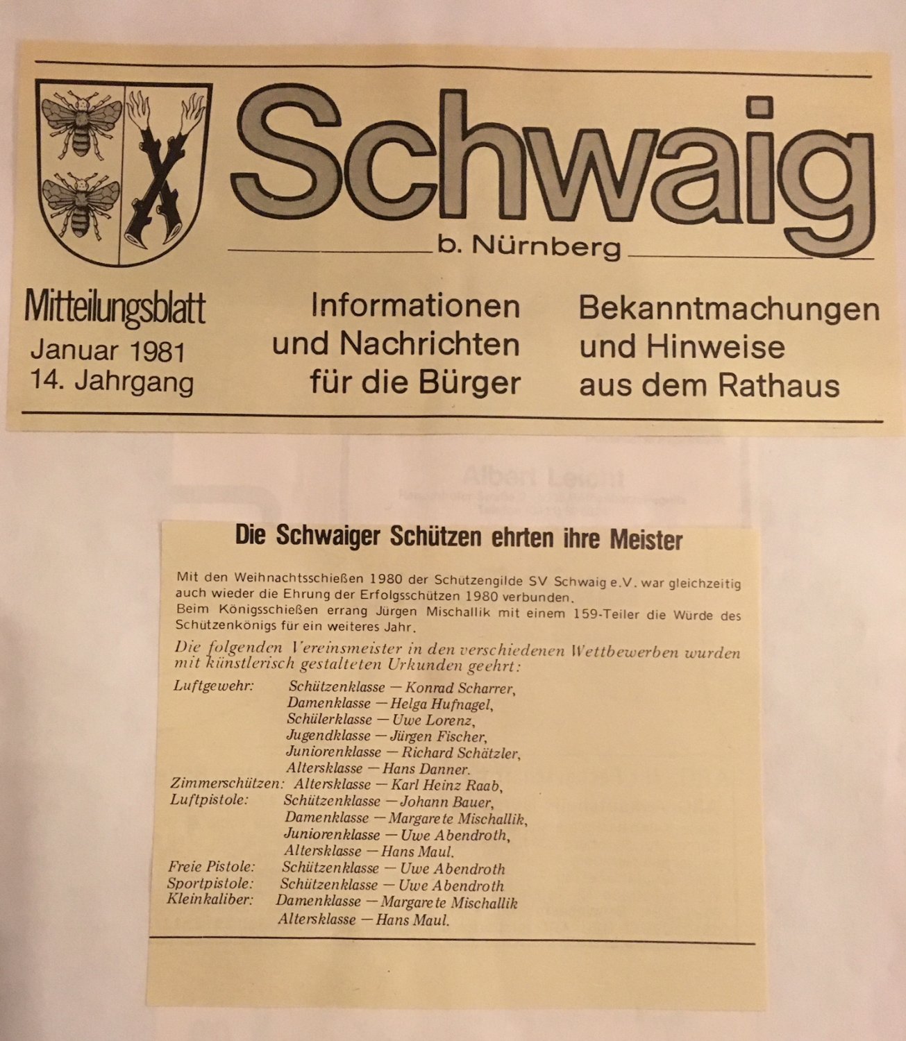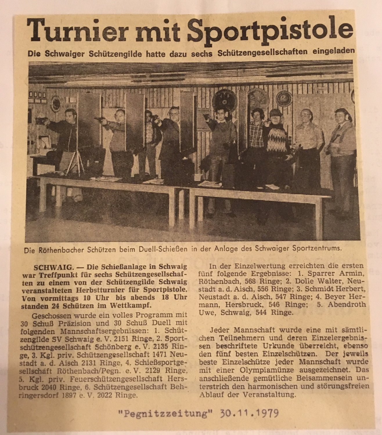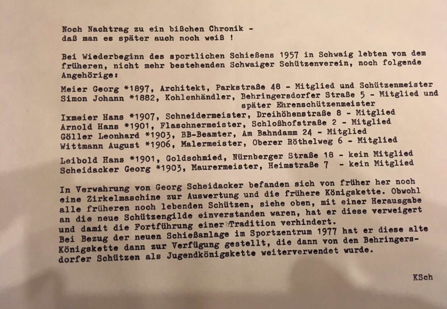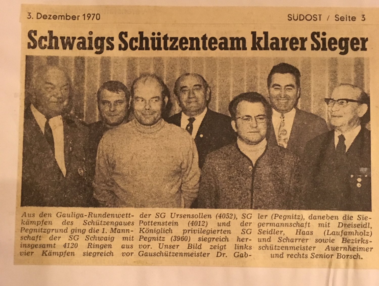 Unter Mithilfe und mit Unterstützung einiger Schützenkameraden aus dem alten Schützenverein, entstand für wenig Geld, dafür aber mit viel Idealismus der freiwilligen Helfer ein Anbau zum alten, inzwischen auch bereits abgebrochenen Sportheim an der Altdorfer Straße mit 6 Schießbahnen auf 10 m. Das sportliche Schießen konnte in Schwaig unter Schützenmeister Georg Meier wieder beginnen.