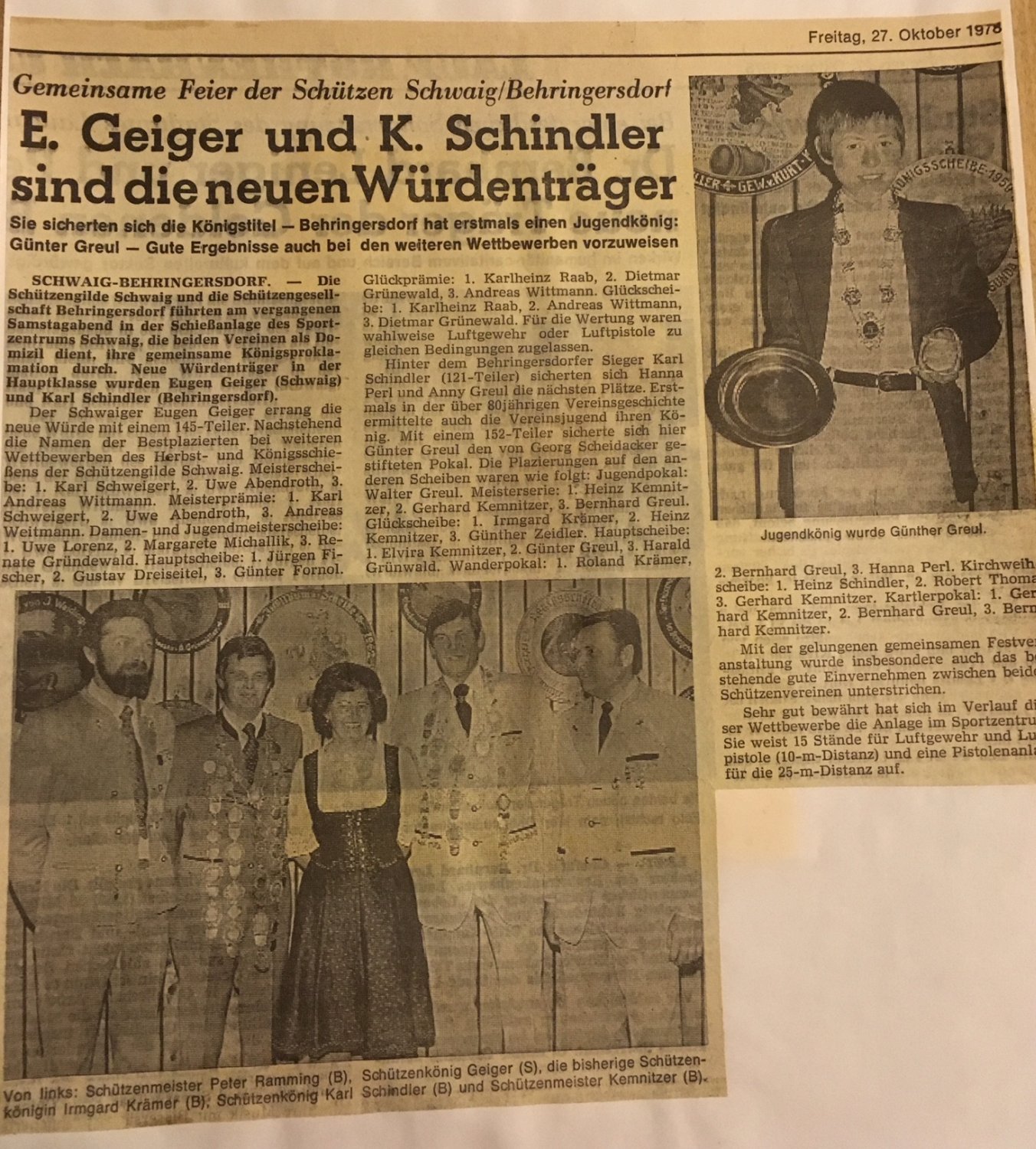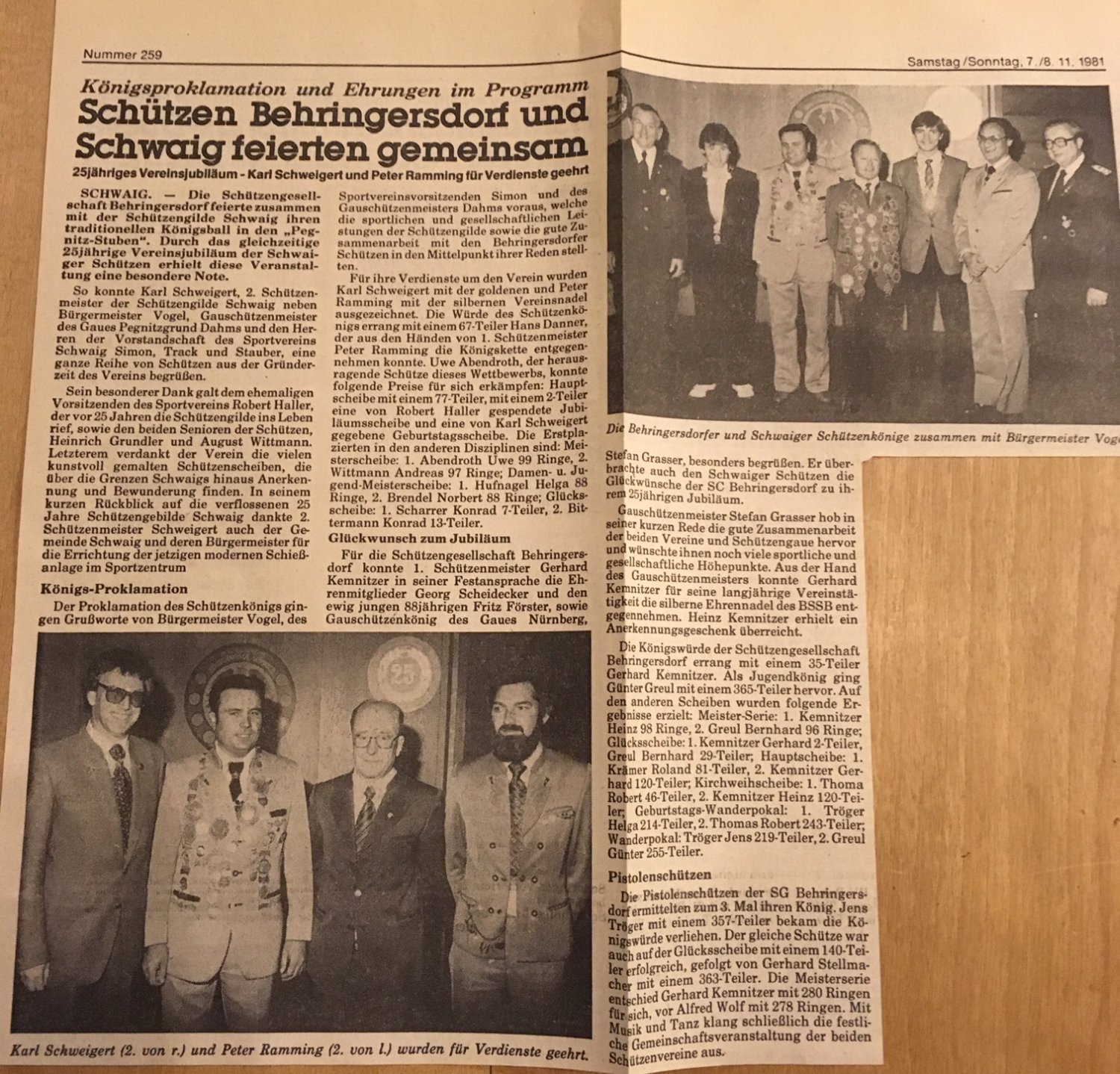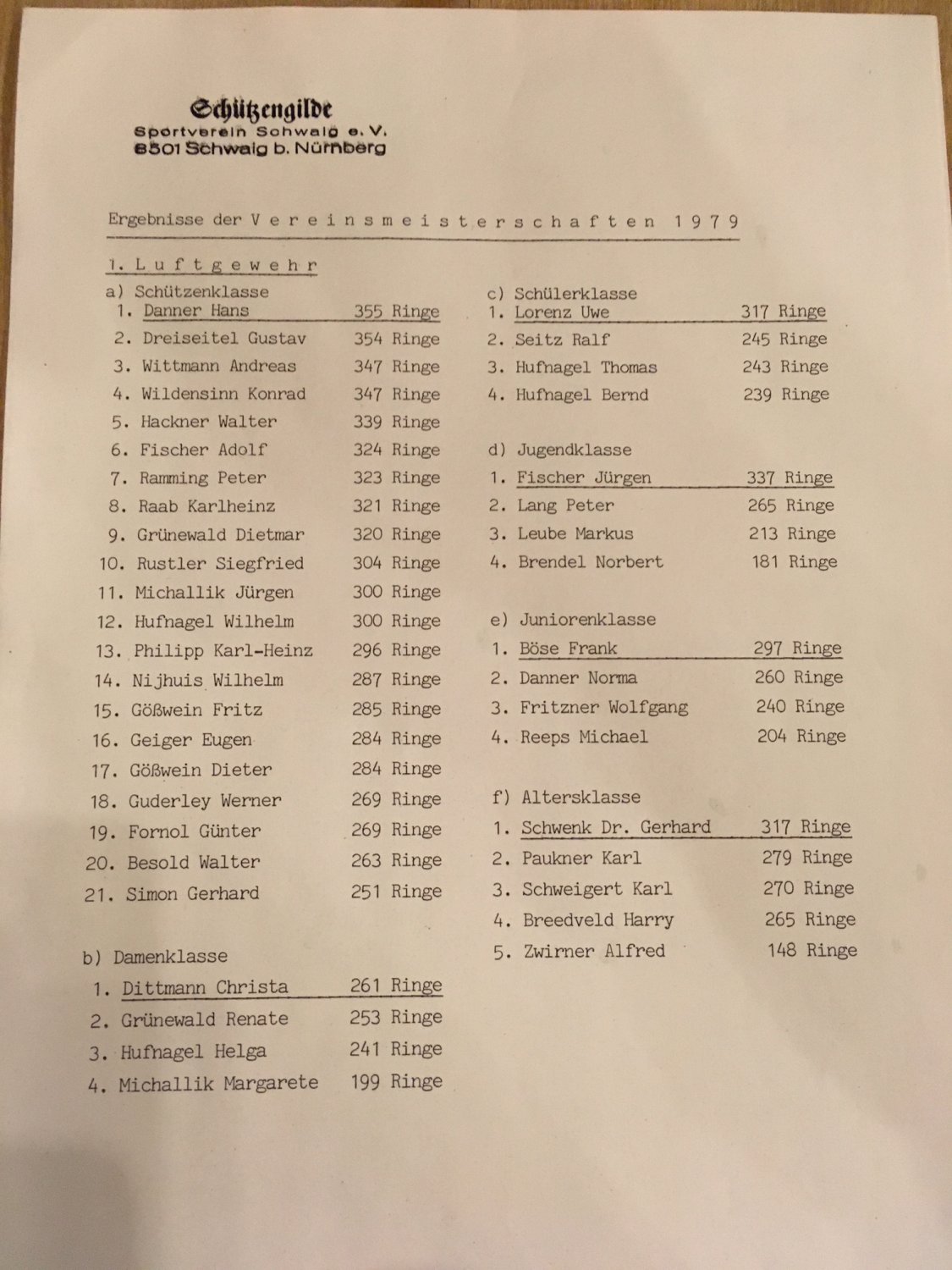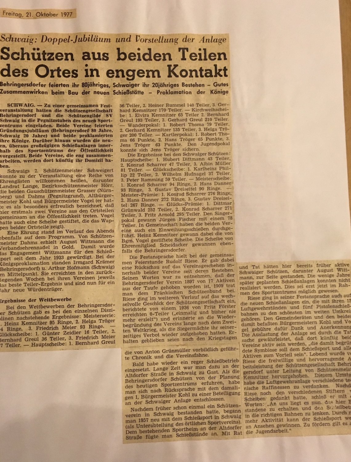 Unter Mithilfe und mit Unterstützung einiger Schützenkameraden aus dem alten Schützenverein, entstand für wenig Geld, dafür aber mit viel Idealismus der freiwilligen Helfer ein Anbau zum alten, inzwischen auch bereits abgebrochenen Sportheim an der Altdorfer Straße mit 6 Schießbahnen auf 10 m. Das sportliche Schießen konnte in Schwaig unter Schützenmeister Georg Meier wieder beginnen.