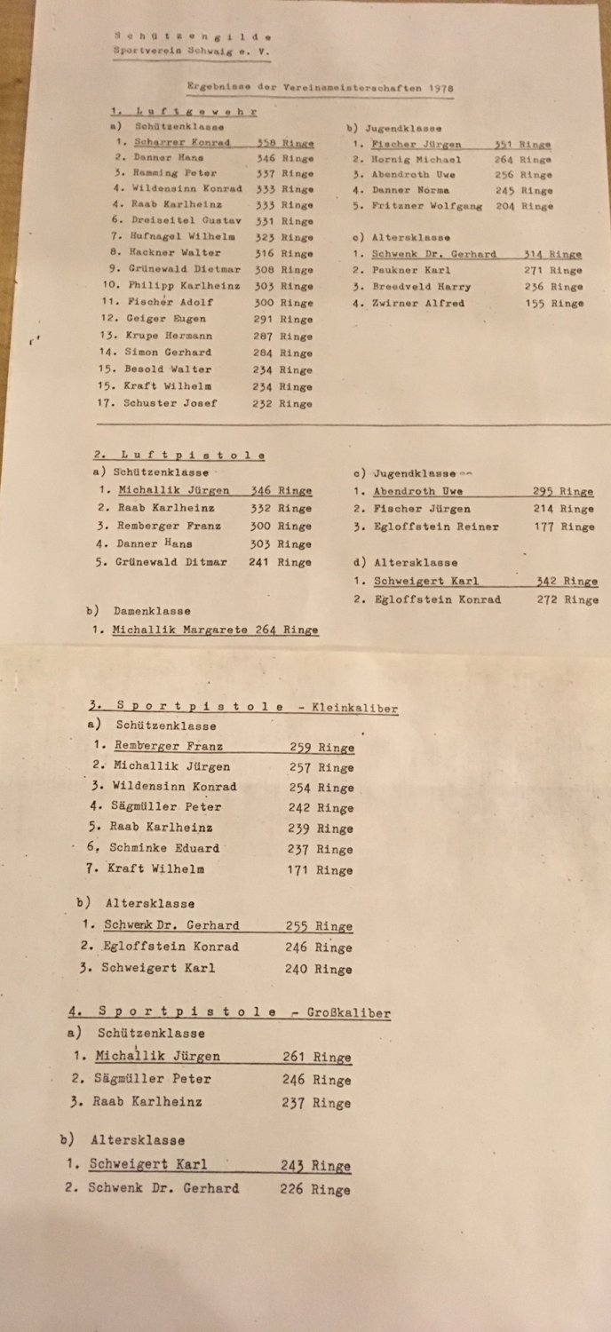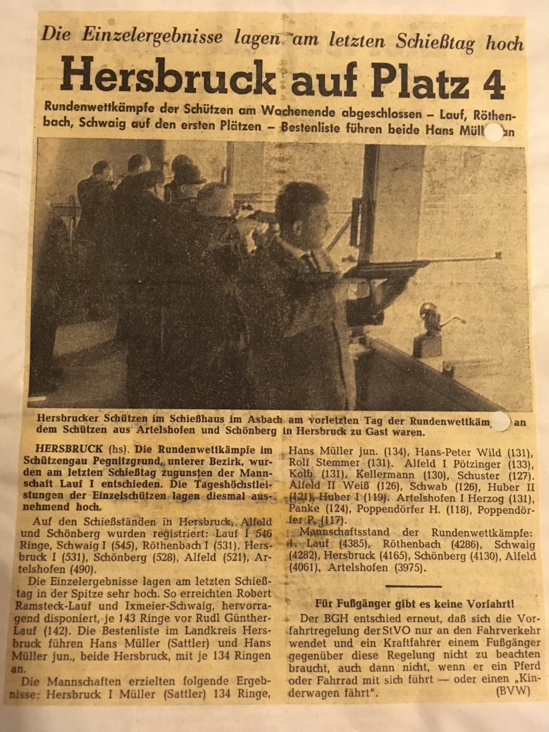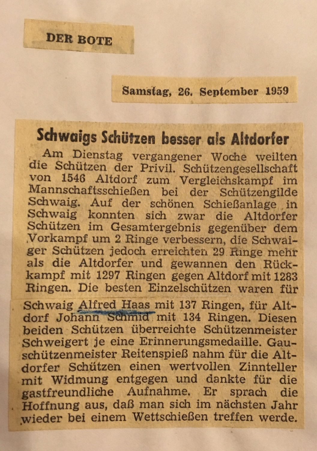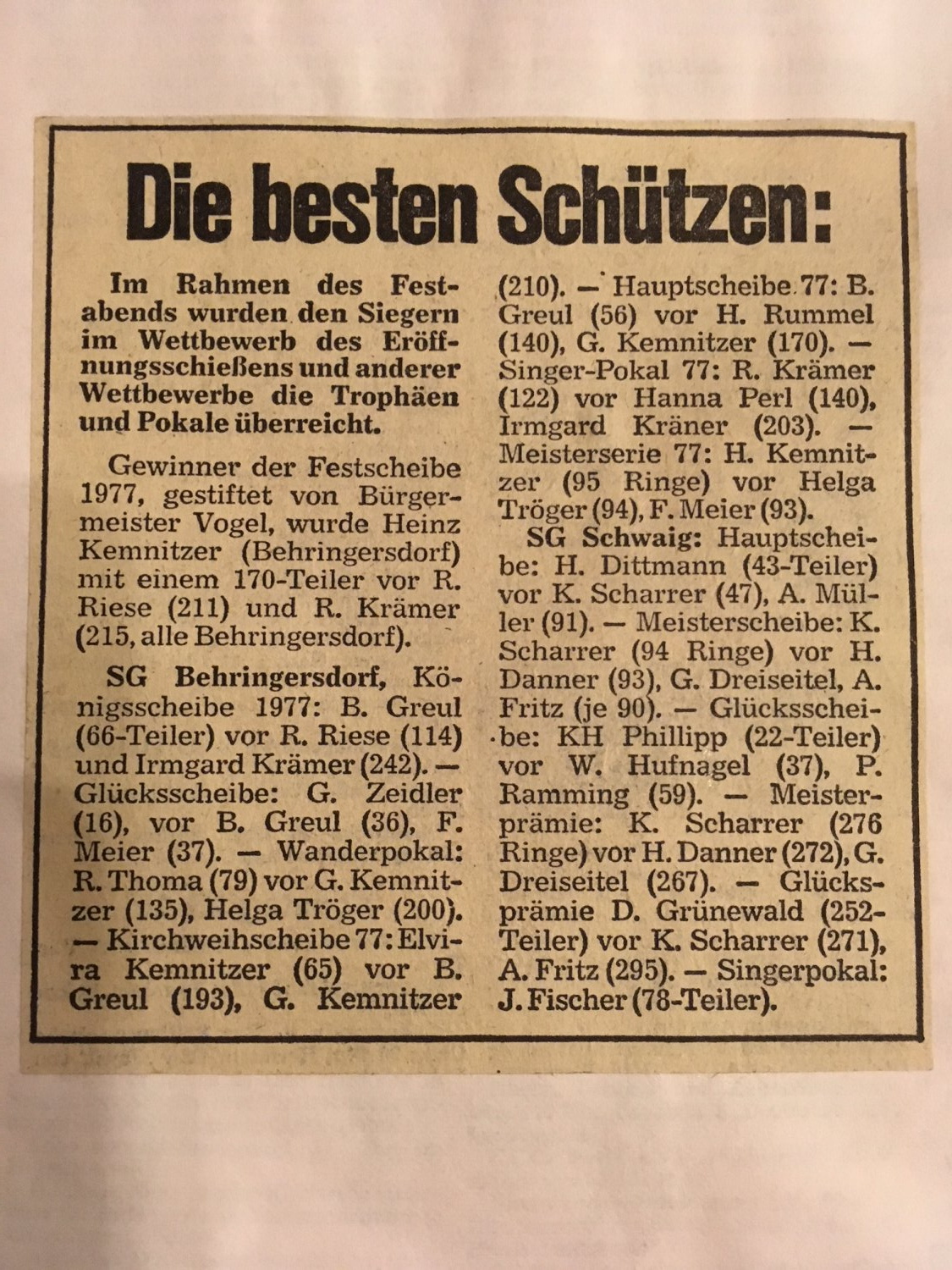 Unter Mithilfe und mit Unterstützung einiger Schützenkameraden aus dem alten Schützenverein, entstand für wenig Geld, dafür aber mit viel Idealismus der freiwilligen Helfer ein Anbau zum alten, inzwischen auch bereits abgebrochenen Sportheim an der Altdorfer Straße mit 6 Schießbahnen auf 10 m. Das sportliche Schießen konnte in Schwaig unter Schützenmeister Georg Meier wieder beginnen.