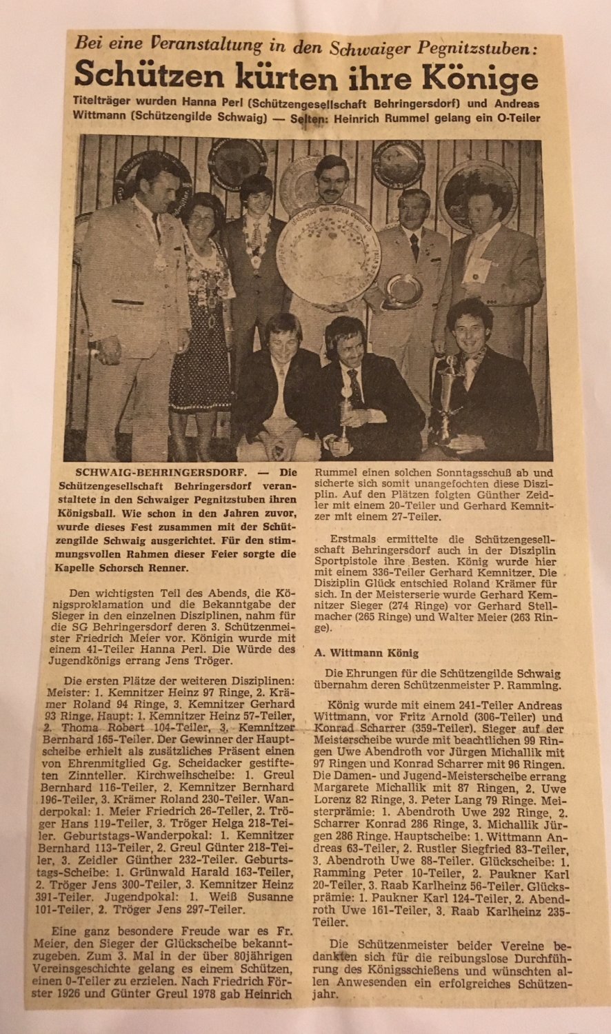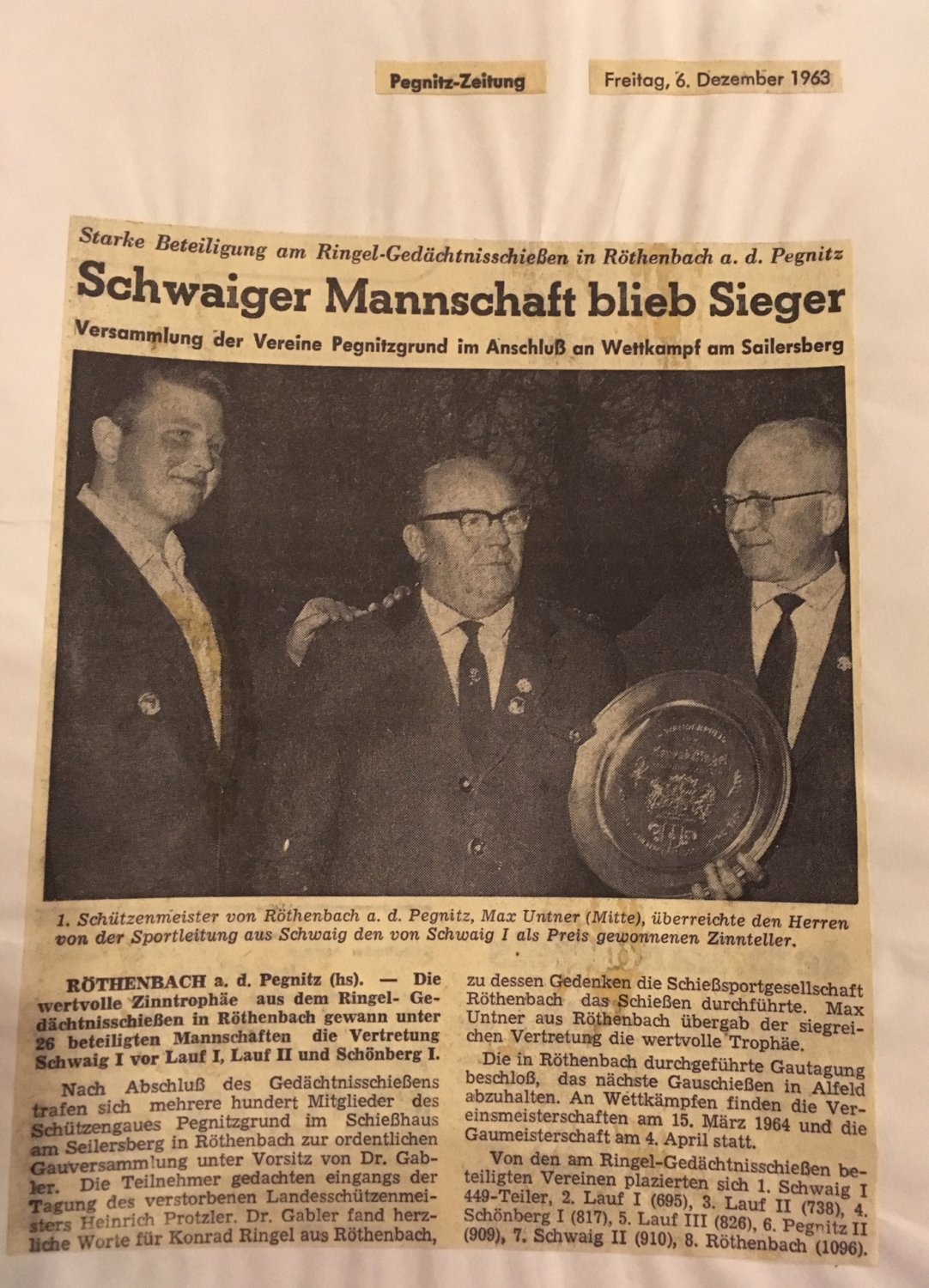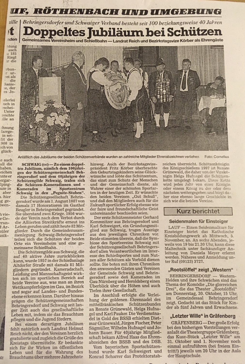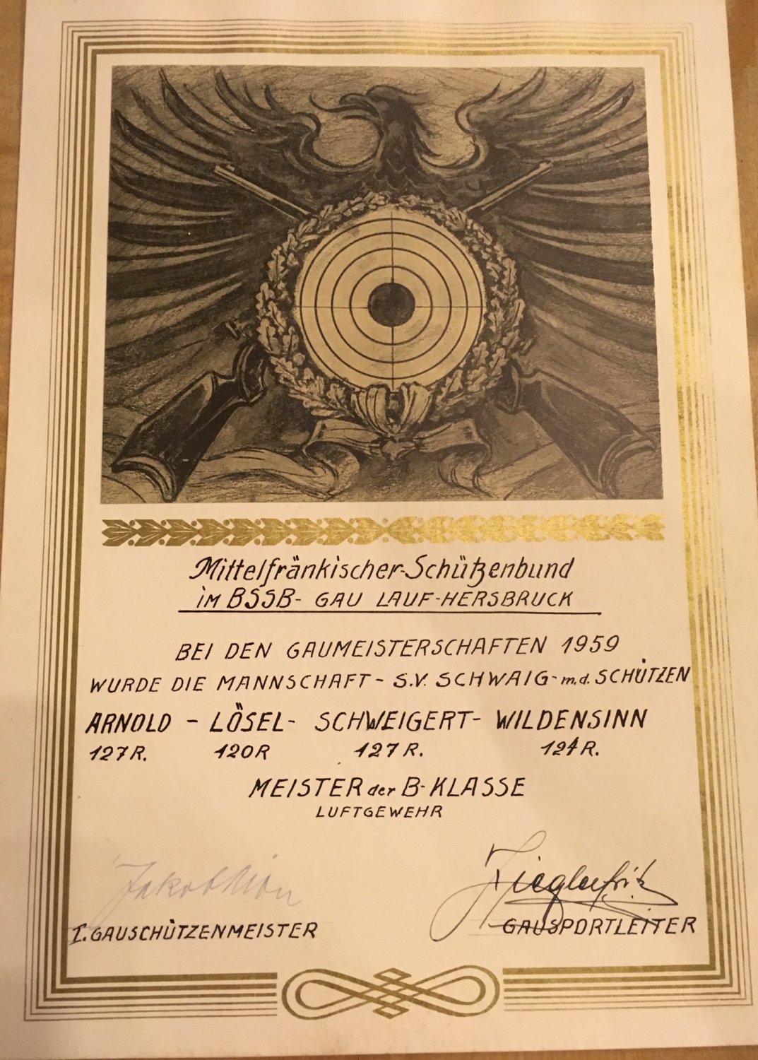 Unter Mithilfe und mit Unterstützung einiger Schützenkameraden aus dem alten Schützenverein, entstand für wenig Geld, dafür aber mit viel Idealismus der freiwilligen Helfer ein Anbau zum alten, inzwischen auch bereits abgebrochenen Sportheim an der Altdorfer Straße mit 6 Schießbahnen auf 10 m. Das sportliche Schießen konnte in Schwaig unter Schützenmeister Georg Meier wieder beginnen.