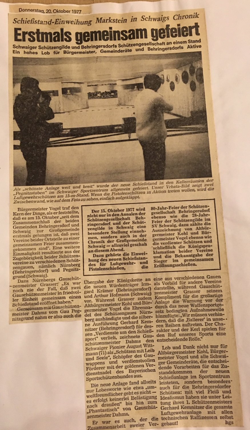 Im Kellergeschoss wurde dabei dankenswerter Weise auch eine Schießanlage mit 15 Luftgewehrschießbahnen auf 10 m und 5 Pistolenständen auf 25 m vorgesehen. Ein Schützentraum ging in Erfüllung, die Anlage wurde gebaut und konnte 1977 in Betrieb genommen werden. Sie brachte dem Schießsport in Schwaig einen neuen sehr erwünschten erheblichen Aufschwung und kann als unterirdische Anlage im Hinblick auf Umweltschutz als Ideallösung betrachtet werden.