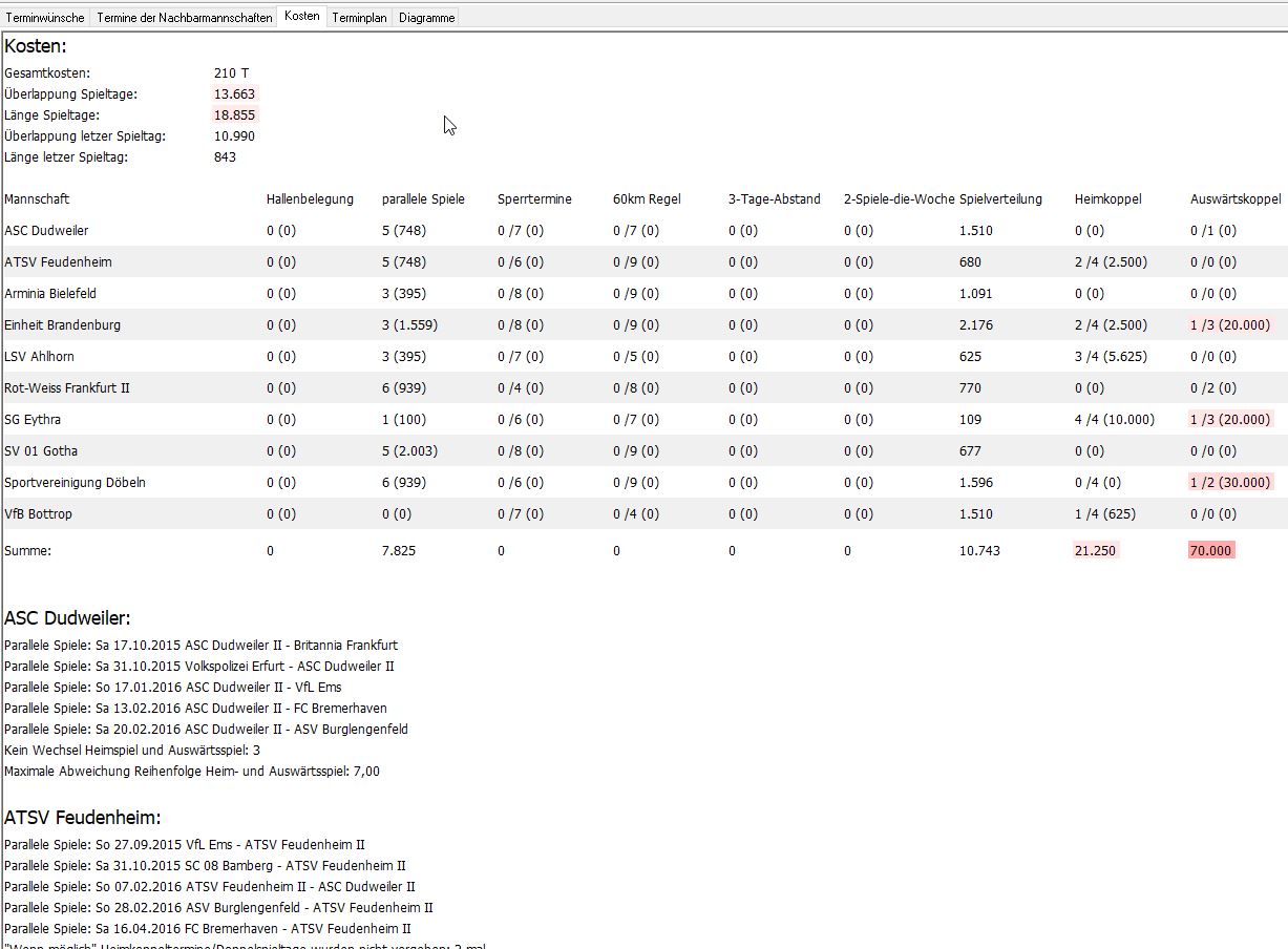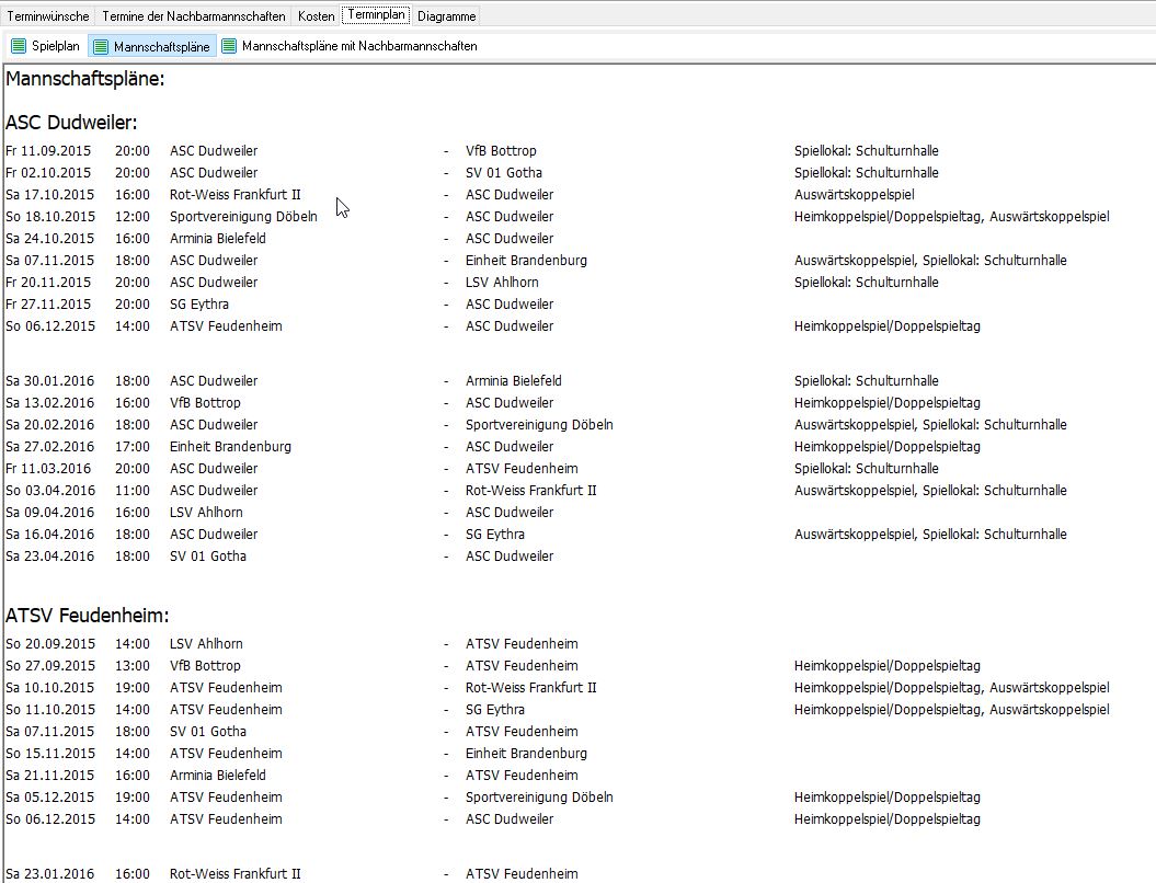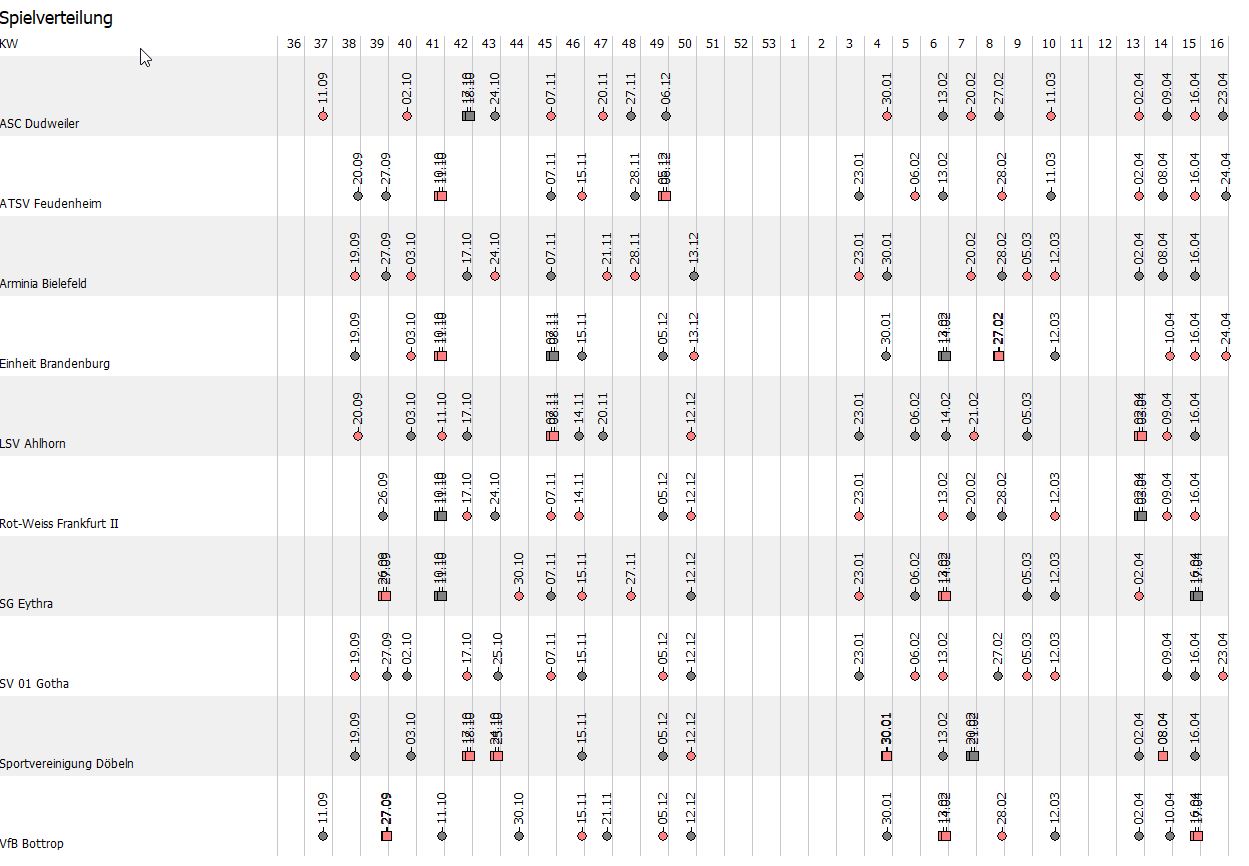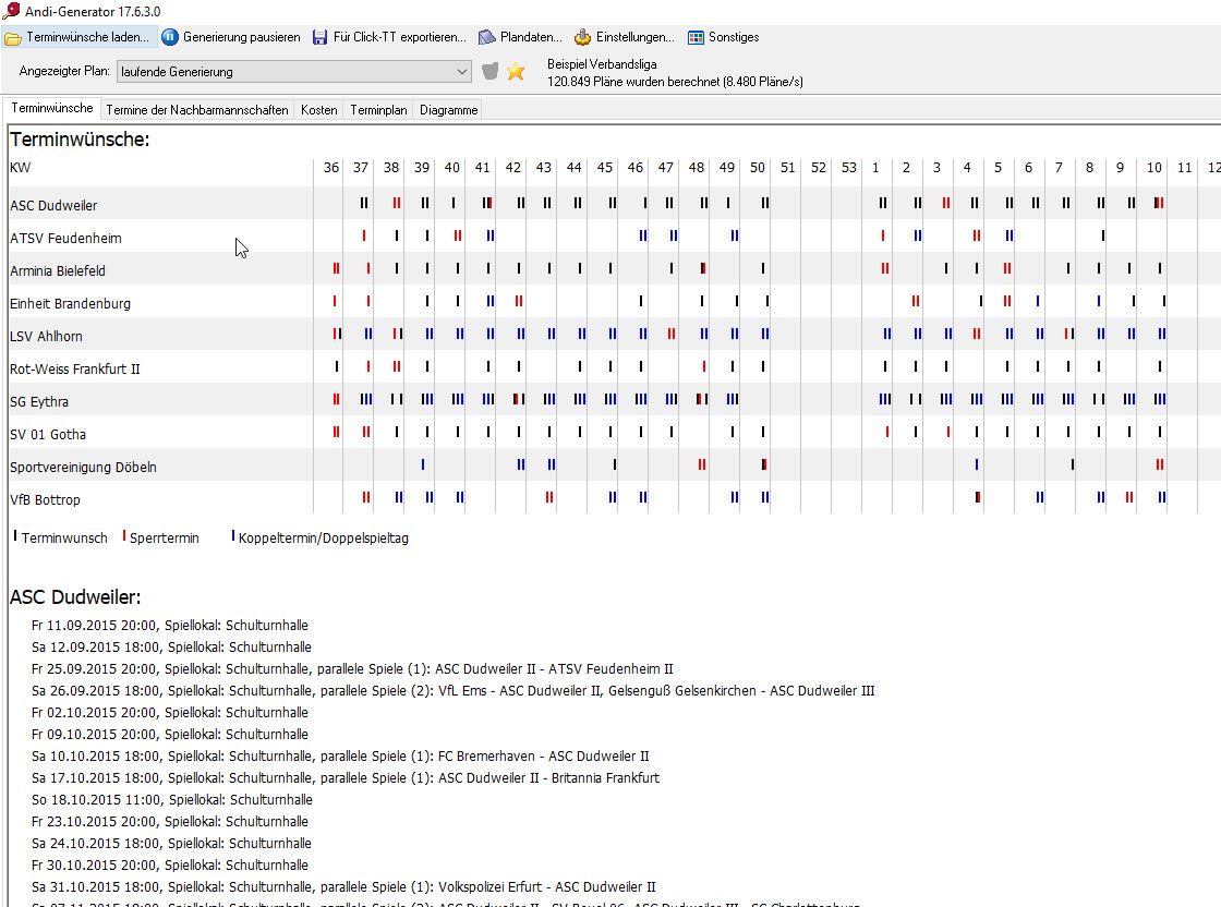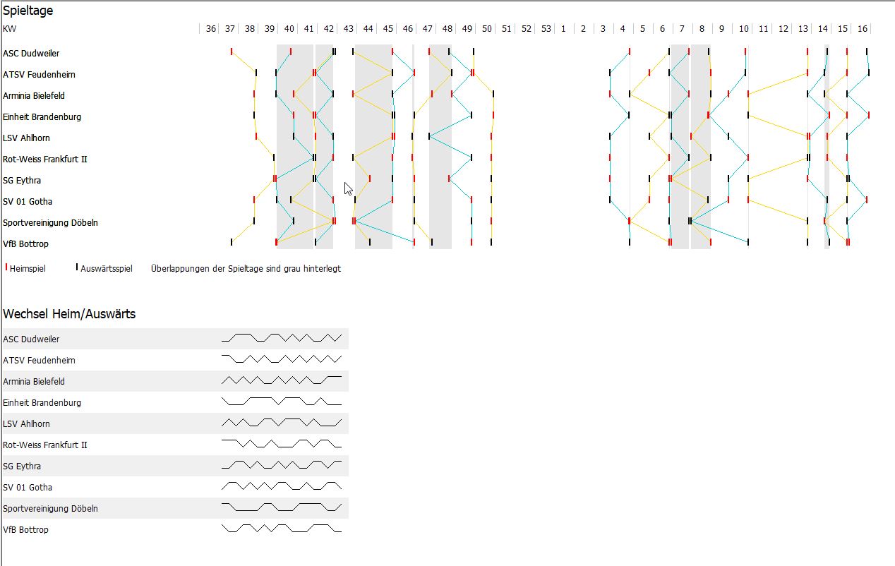 Nach den ersten positiven Versuchen ging die Entwicklung weiter und jetzt berücksichtigt der Generator auch exotische Features (Doppelrunde, Koppeltermine, Auswärtskoppeltermine, Pflichtspieltage, Ausweichtermine).