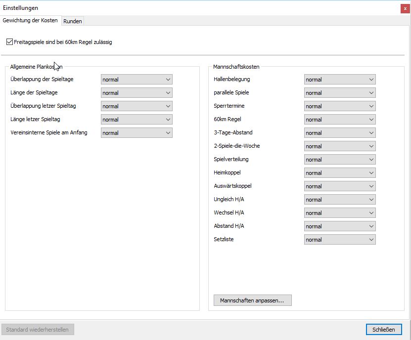 Manche Kosten ergeben bei bestimmten Mannschaften keinen Sinn. Falls z.B. eine Mannschaften wegen der Sanierung der Halle in der Vorrunde nur Auswärtsspiele machen kann, so kann für diese Mannschaft die Kostenart 'Wechsel Heim/Auswärts' auf 'nicht berücksichtigen' gestellt werden.